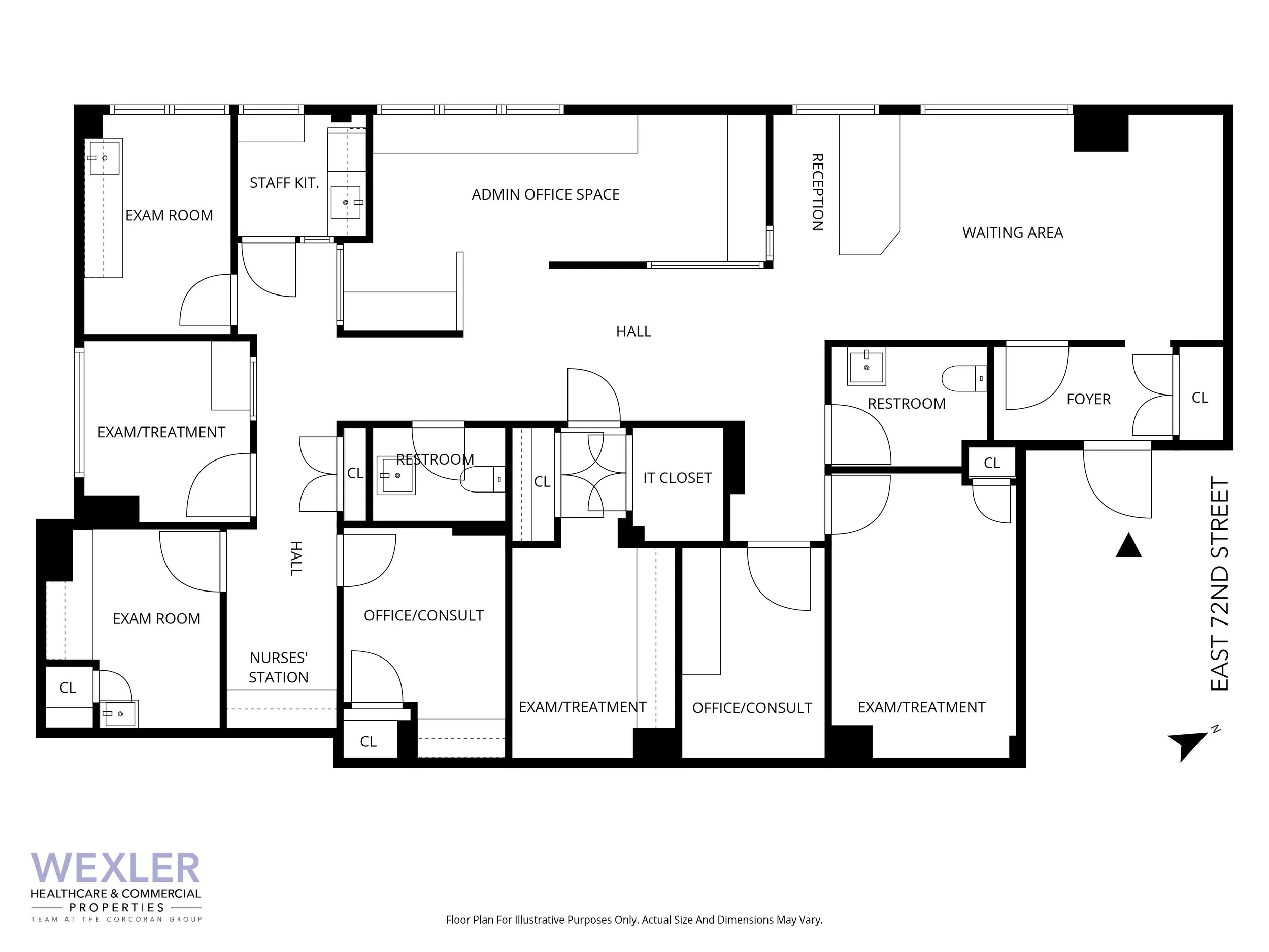 The layout of approximately 1,800 square feet includes a large area, a reception, admin office space, five exam/treatment rooms, two offices/consults, a nurses’ station, a staff kitchenette, two restrooms, and an IT closet.