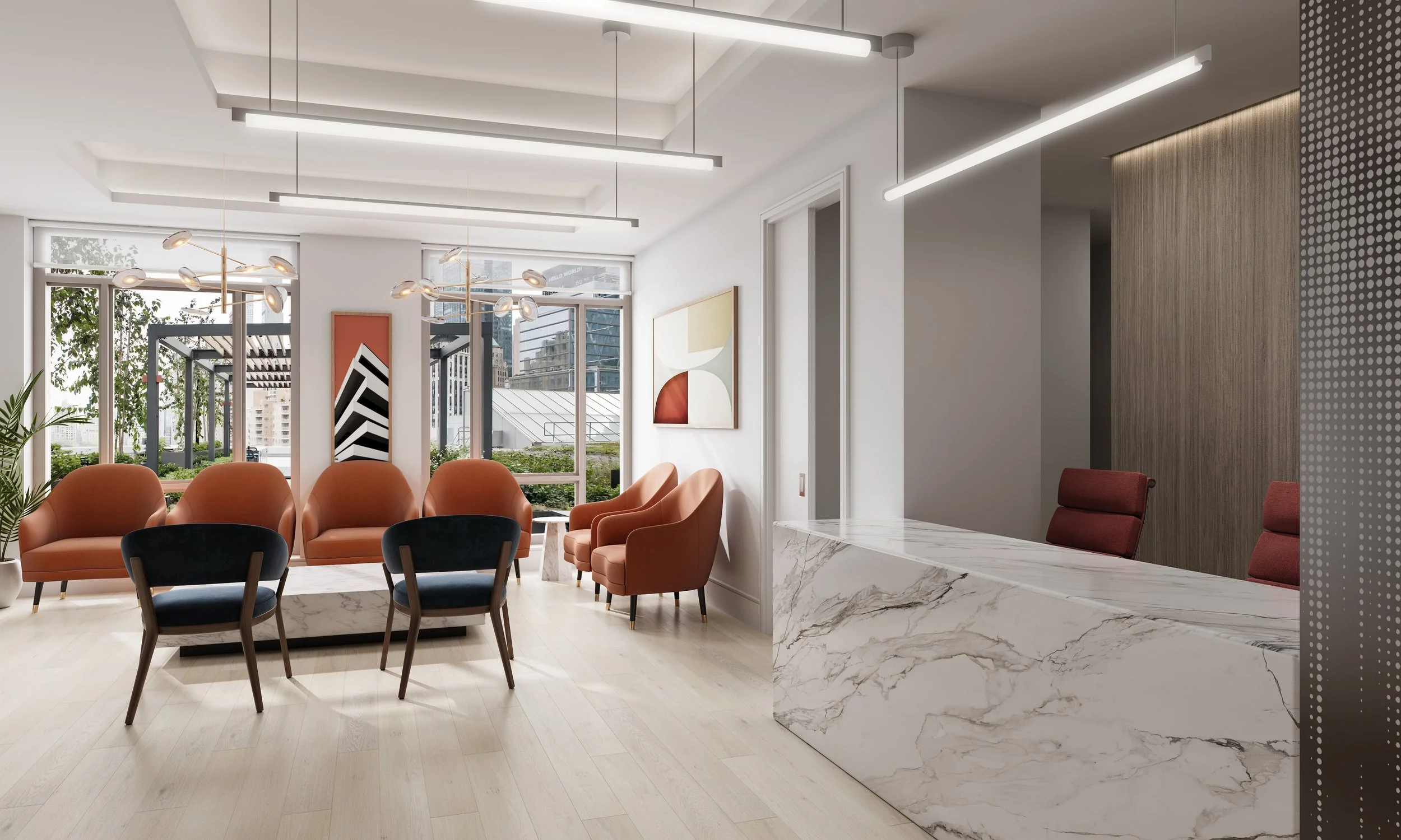 The meticulously designed perinatal therapy and fertility clinic space offers a layout of approximately 2,337 square feet. Upon entering the private street entrance on Park Ave, patients proceed through a private foyer leading to a large reception and waiting area.