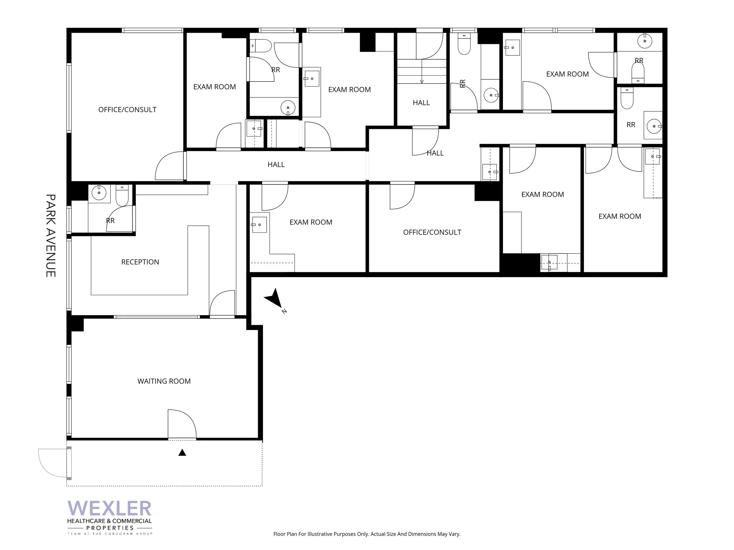 The layout of approximately 2,276 RSF features a large waiting room, a reception area, a file/storage/admin office, four exam rooms, five offices/consults, and two restrooms. This space is adaptable to any medical specialty.