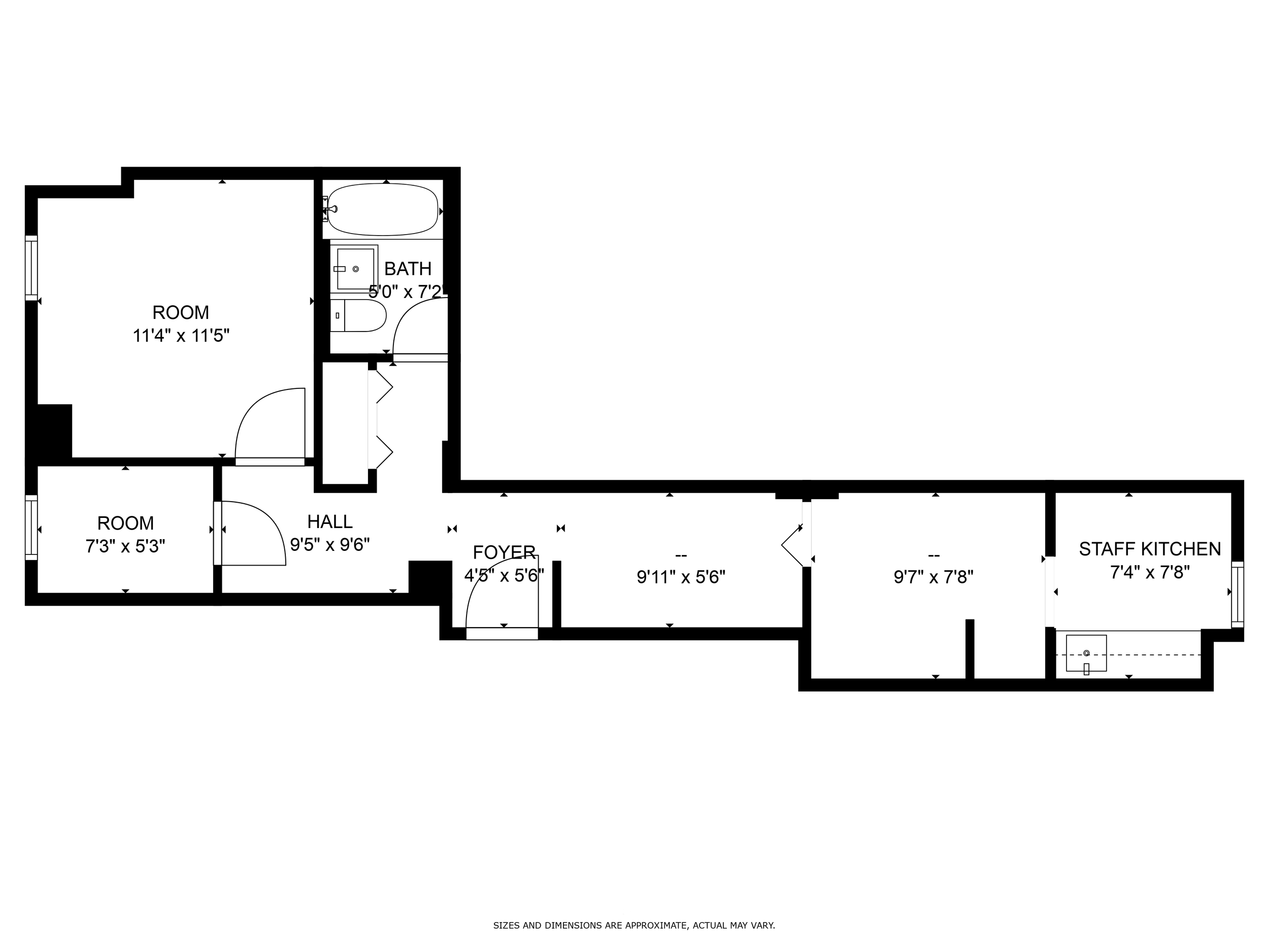 The layout of approximately 601 square feet features two rooms ideal for offices/exam rooms, a staff kitchen, and two additional adjoining spaces ideal for a waiting area, private office, etc.