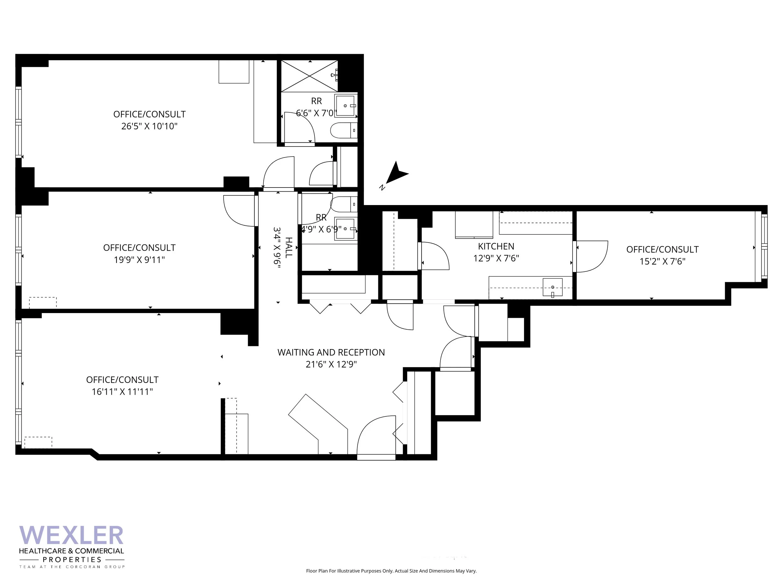 The office features four oversized rooms, a waiting and reception area, a kitchen, and two restrooms. This 1,432 square-foot suite is adaptable to any medical specialty.