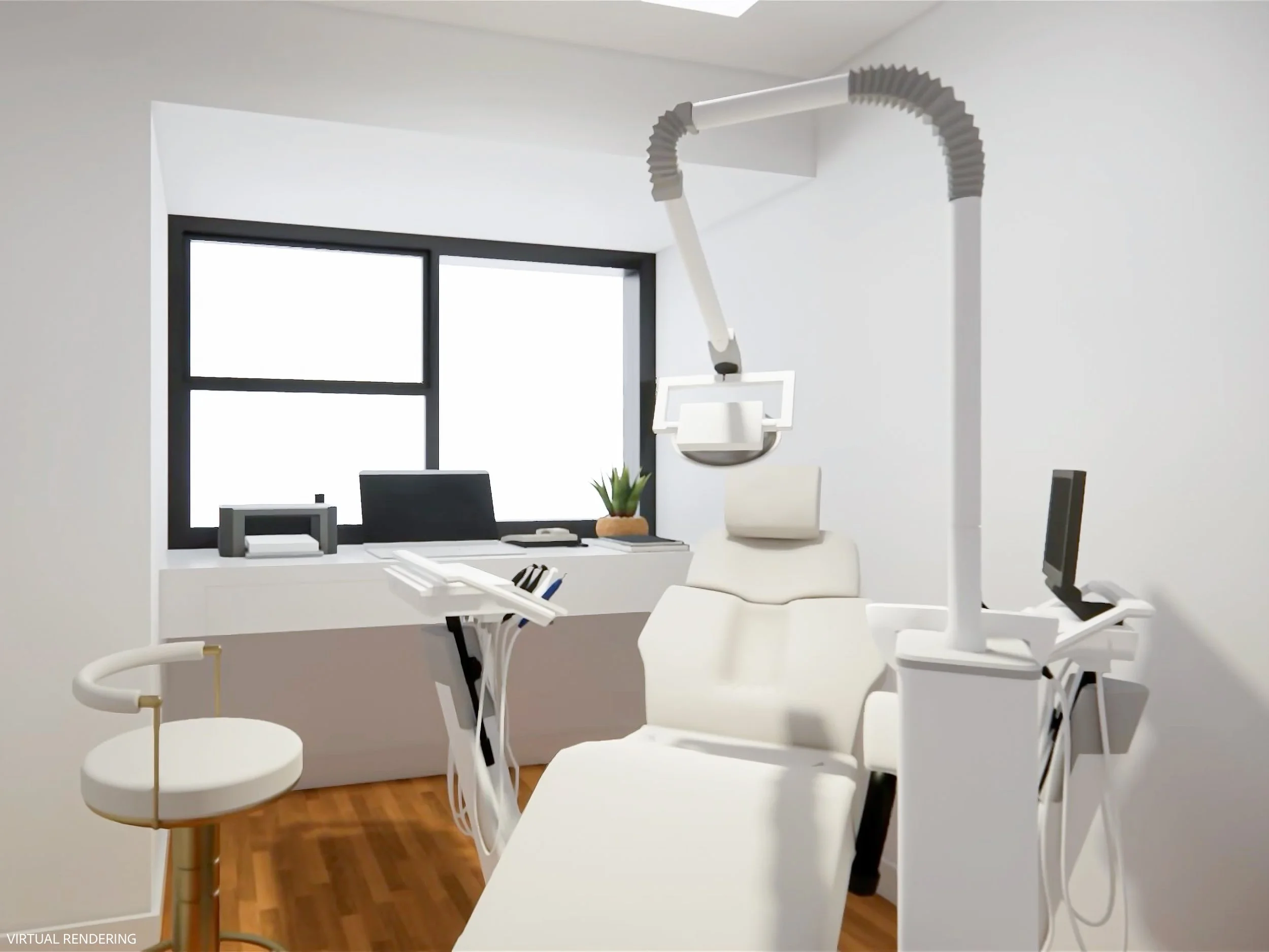 The office features a large waiting and reception area, three exam rooms, two offices/consults, a lab, and two restrooms. This 1,249 square-foot suite is adaptable to any medical specialty.