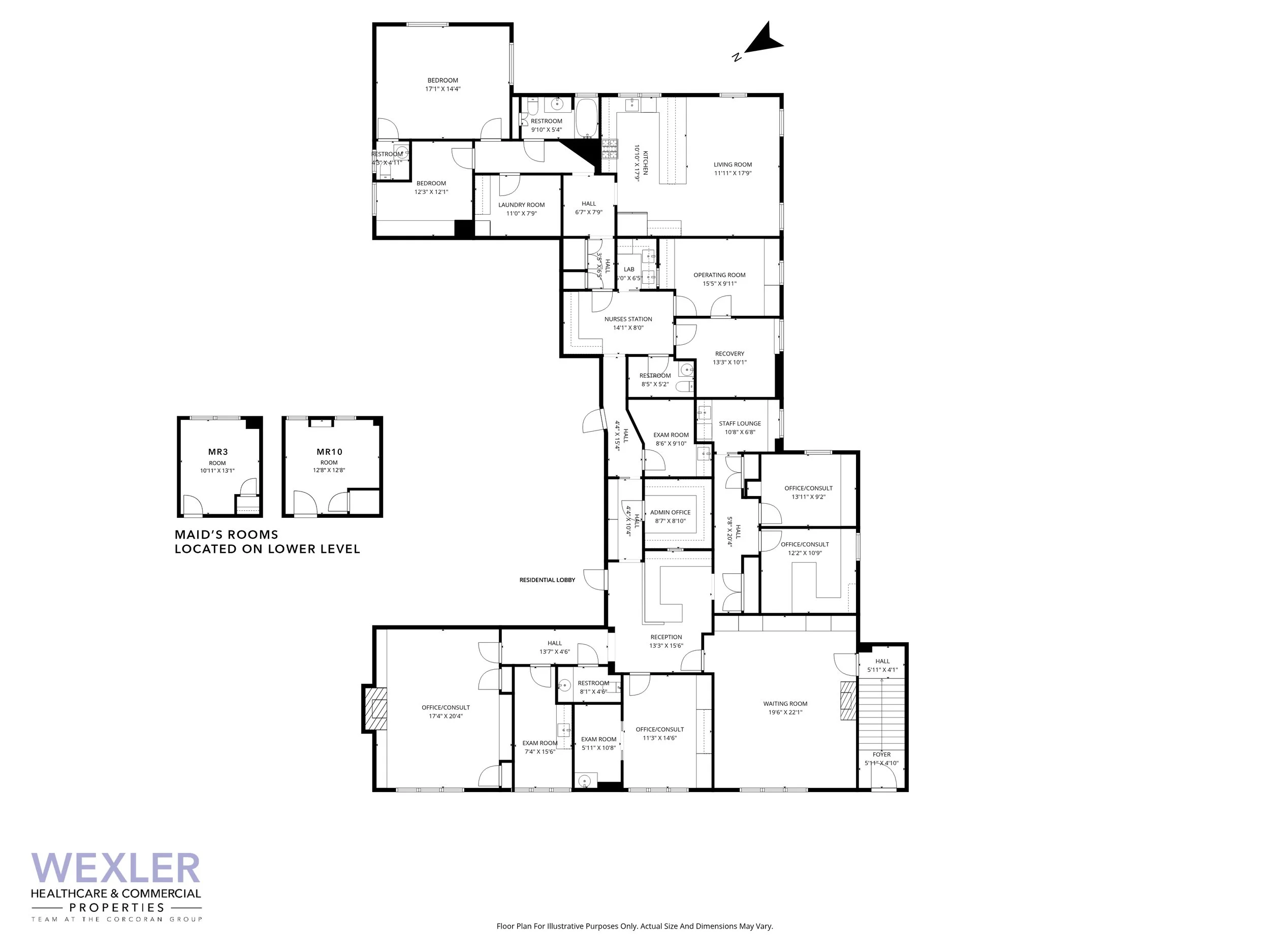 The medical layout includes a welcoming waiting room with a fireplace feature, a dedicated reception, three exam rooms, four consultation offices, an administrative office, a QUAD-A accredited operating room, a recovery room, a laboratory, a nurses’ station, a staff lounge, and two restrooms.