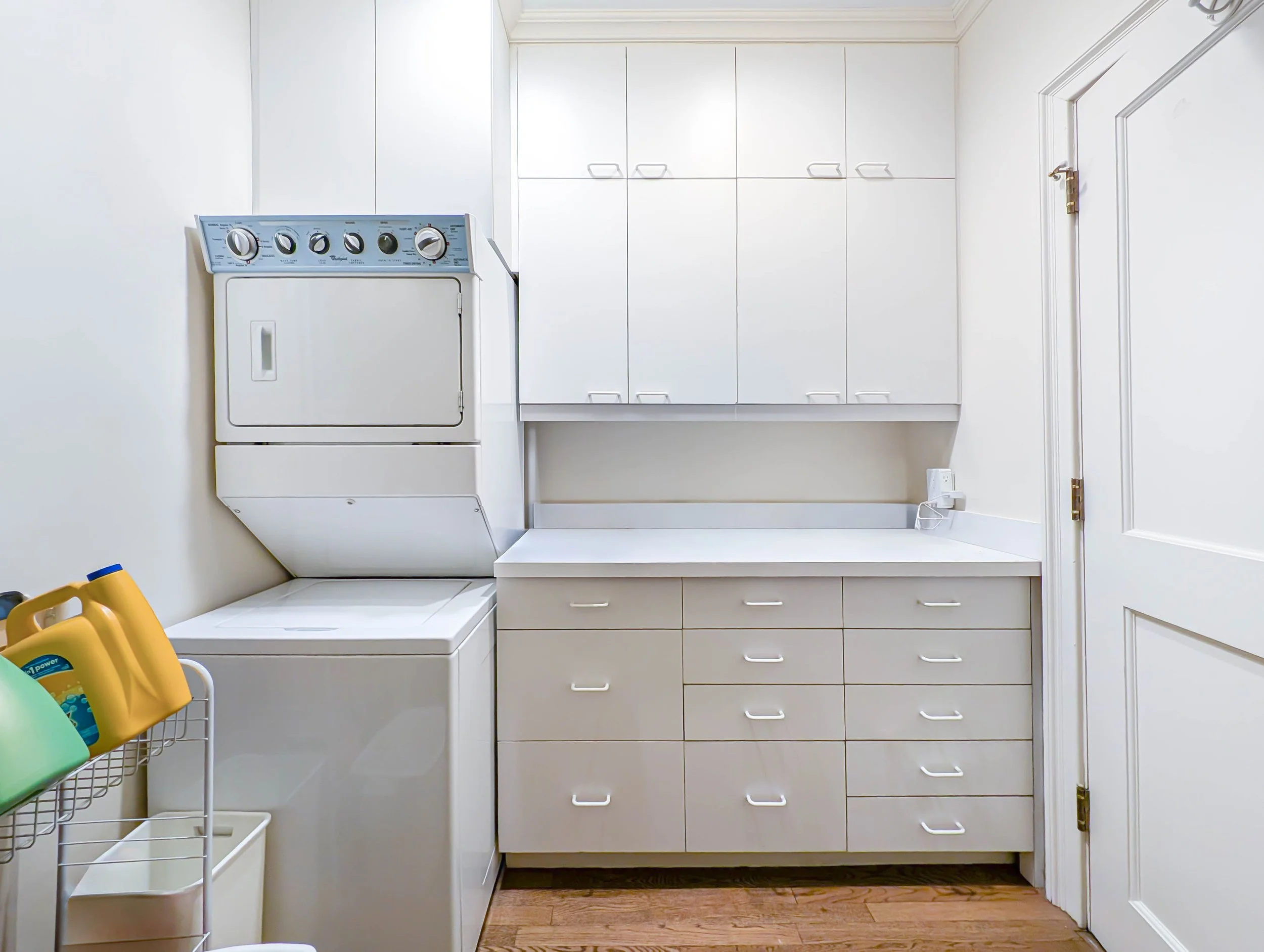 The residential portion of the unit includes a primary bedroom with an en-suite, a second bedroom, one full bathroom, one half bathroom, a kitchen, a living room, and a laundry room.