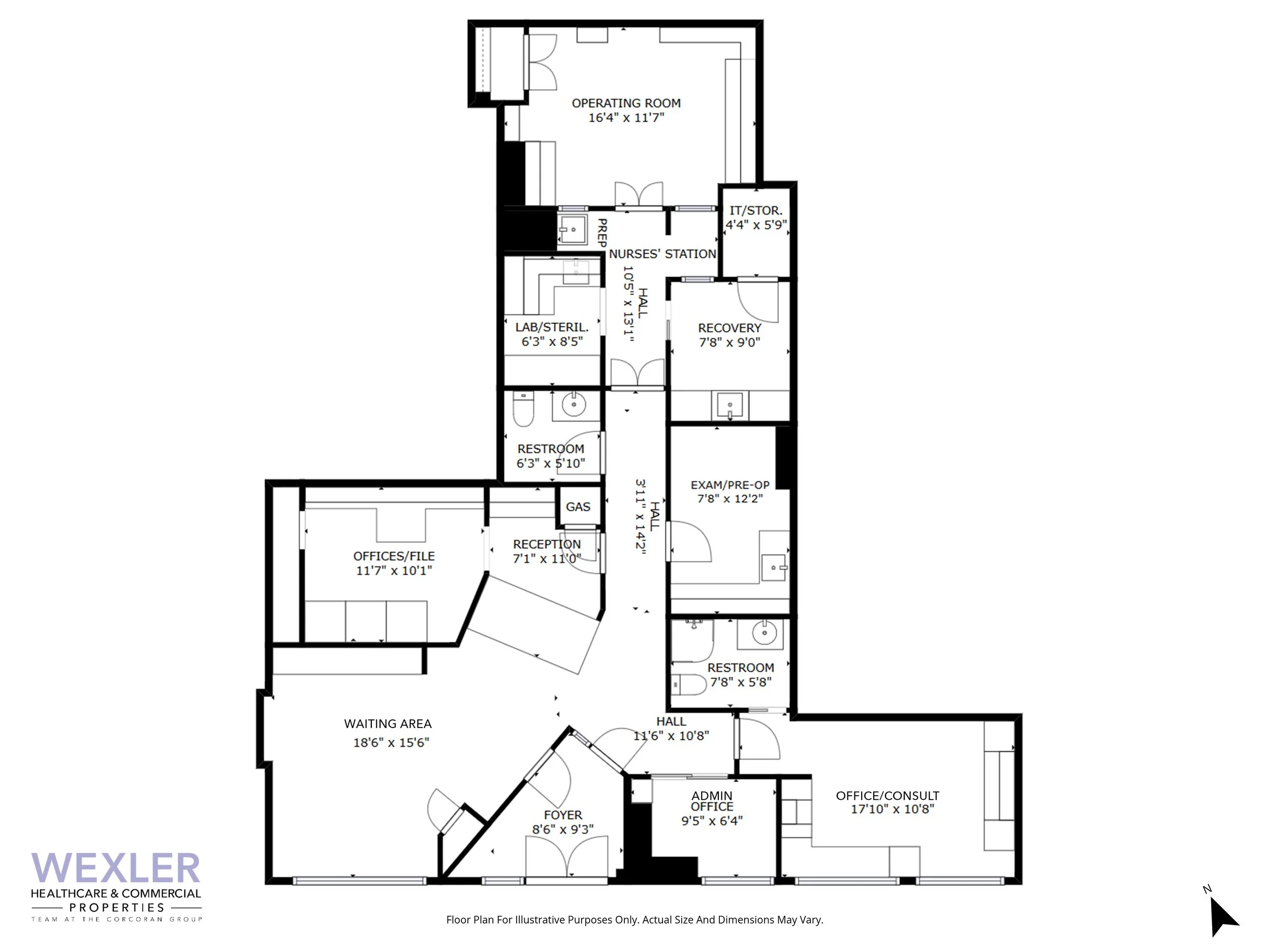 The current layout includes waiting and reception areas, operating room built to Quad-A standards at the time of construction, a prep/nurses’ station, a recovery/exam room, a pre-op/exam room, a lab/sterilization room, an office/consult with private bathroom, an admin/manager office, a two-station admin/file room, a gas closet, and restroom.