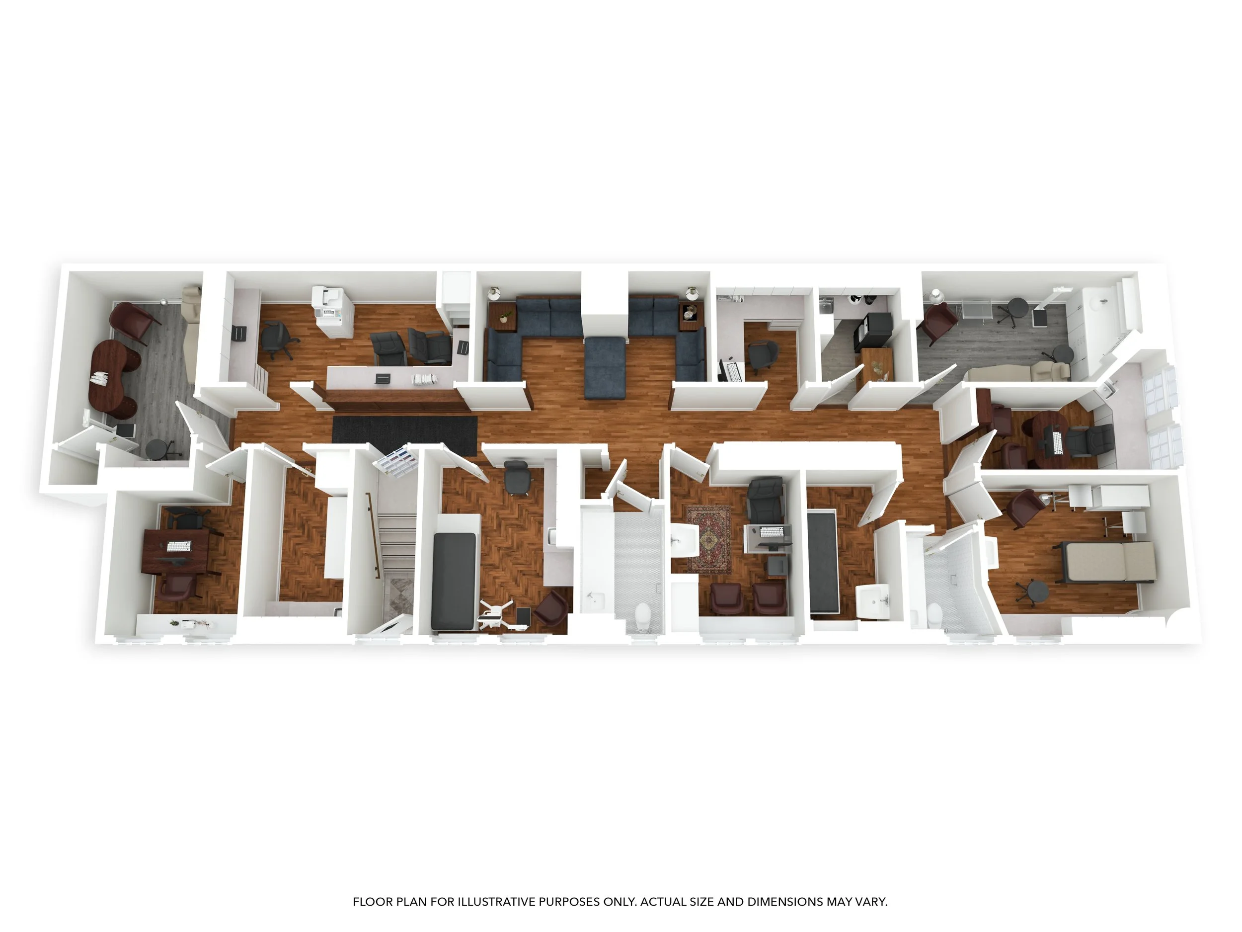 The office features waiting and reception areas, seven exam rooms, two offices/consults, an admin office, two restrooms, and a staff kitchenette.